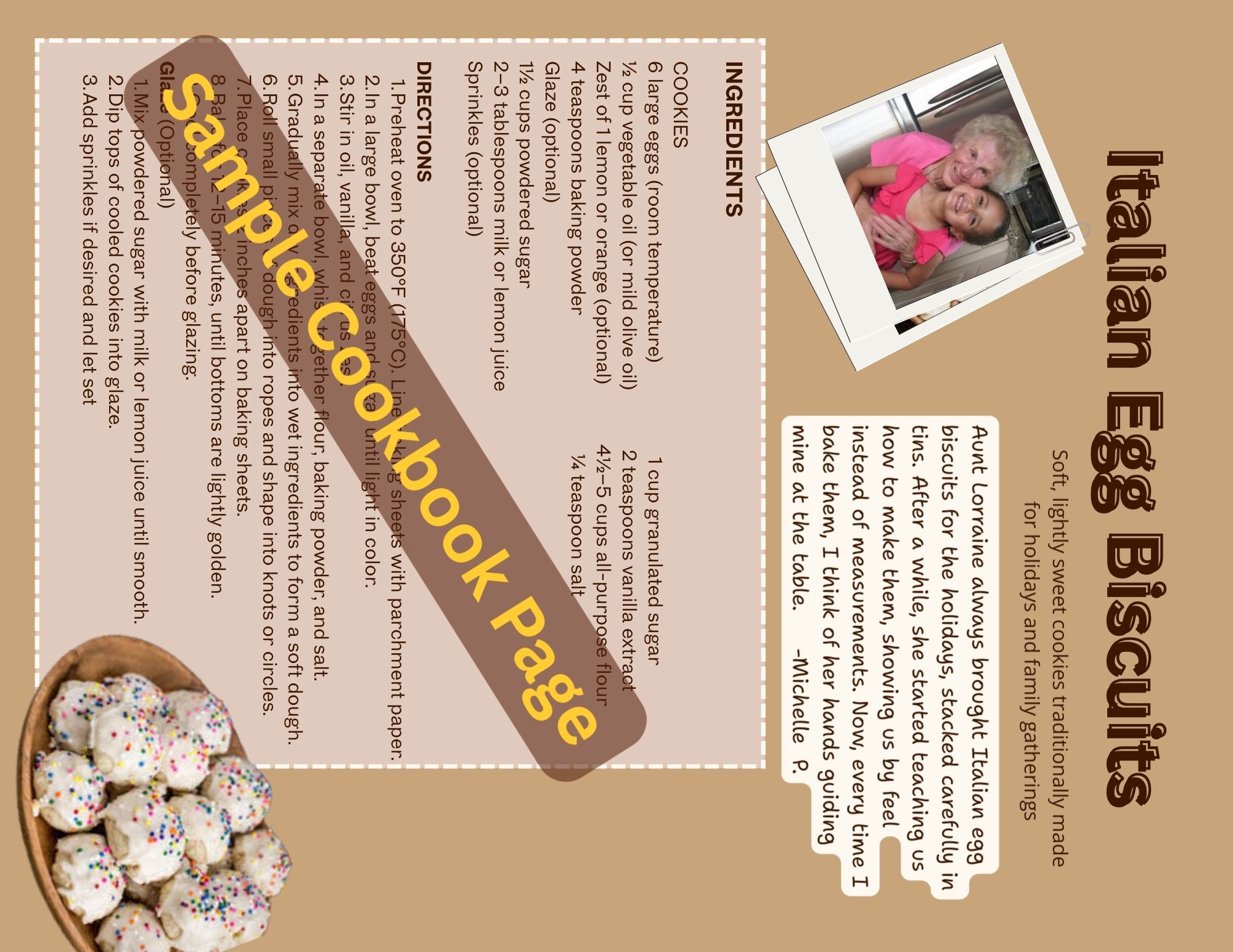 Each page will include your family’s recipe, a photo or two if you choose, and a brief story or memory tied to the dish.