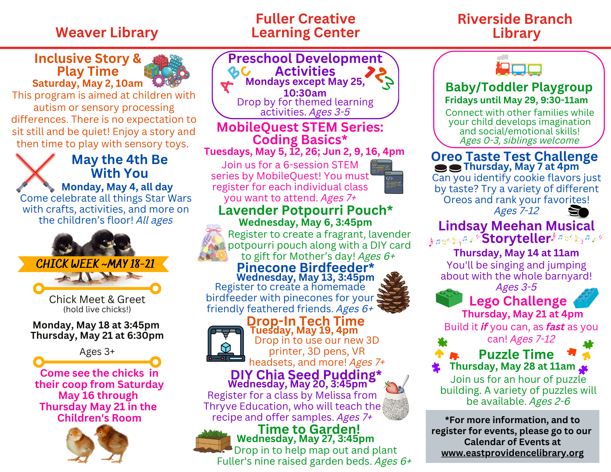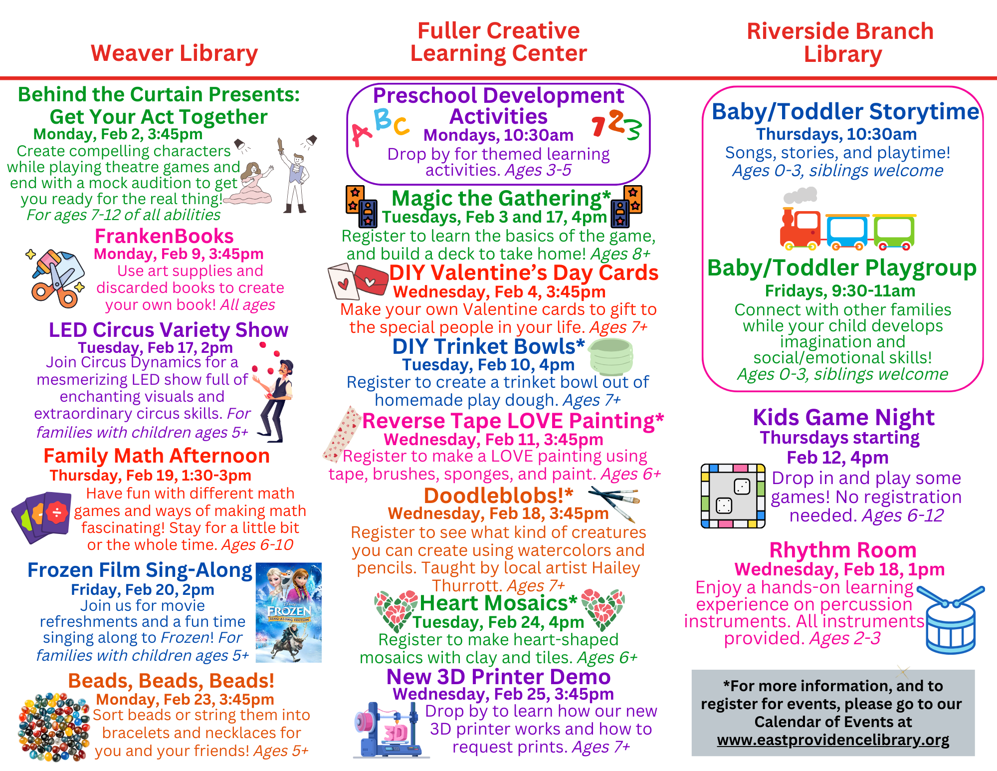 See our monthly flyer below. All programs are 'drop-in' unless otherwise noted. Please contact the Children's Department with any questions.